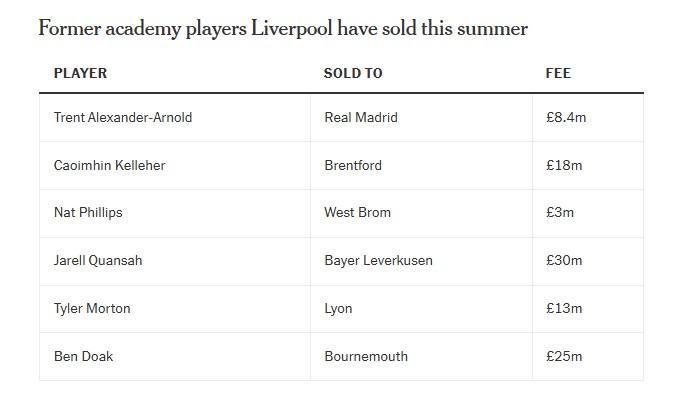过去五年里,利物浦通过出售代表俱乐部参加过青年比赛的球员,收入超过2亿英镑。仅今年夏天,他们就通过阿诺德(皇家马德里)、凯莱赫(布伦特福德)、纳特-菲利普斯(西布朗)、贾雷尔-昆萨(拜耳勒沃库森)、泰勒-莫顿(里昂)和本-多克(伯恩茅斯)的转会,赚取了约1亿英镑。埃利奥特以430万英镑从富勒姆加盟时年仅16岁,他在截止日以租借形式加盟阿斯顿维拉,明年夏天将以3500万英镑的价格强制买断。