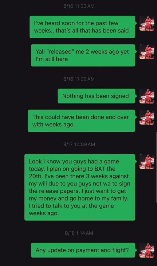 他在社媒上晒出和翔蓝队总经理张适海的聊天记录,从中可以看到截至8月18日,他被球队裁掉了3周仍未收到剩余薪水,此后对方也没用再回复他。